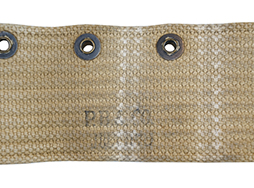 M1 ガーランドのクリップを10個収納することが出来るキャンバス製のカートリッジ・ベルトです。 生地は明るめのカーキ色となっています。 多少の使用感が見られ、一部縫い目の解れがありますが、目立った汚れや破損も見られず概ね良い状態と言えます。 金属部は一部緑青が見受けられますが、スナップ・ボタンの機能に問題はありません。 個体によって裏面に書き込みが見られます。 (MK)(TK)