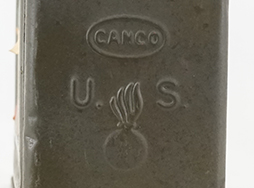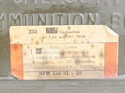 フランス軍の弾薬箱です。 「CAL. .30 M1 AMMUNITION BOX」や「US」の刻印が見られますが、側面及び蓋の裏にフランス語のシールが貼られており、リンク結合の7,62mm225発(180発普通弾、45発曳光弾)入りと記されています。 フランス軍で使用された物と思われます。