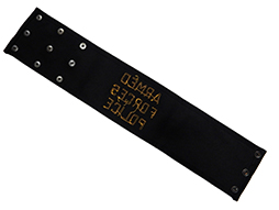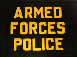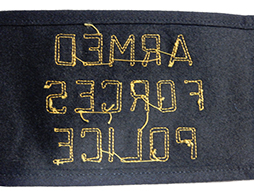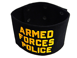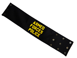 サイズは約50 cm x約 10 cm、黒色生地の腕章に一文字づつ黄色いARMED FORCES POLICEのアルファベットが縫い付けられた丁寧な造りの品です。
