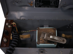 1970年代に英軍が使用した野戦電話機です。ケースにはグレーの塗装が施されており、所々小傷によって塗膜が剥落していますが、大部分に塗装が鮮やかに残っています。 ハンド・セットのコードもまだまだしっかりしている印象ですが、動作は保証できません。 蓋には製造年1979と、メーカーを示す銘板が残っています。 (YS)
