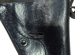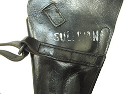 全体に小傷が散見され、銃の収納跡が付いている使用感のある品ですが、全体的に黒色の仕上げがしっかりと残っています。 革自体はしなやかで充分に柔らかさを保っています。 ストラップも癖こそ付いていますが目立つヒビや破れはなく大変しっかりとしています。 表面には若干薄れていますが「US」のスタンプ。 裏面には「HUNTER CORP 7142700」とスタンプと一部判読しづらいですが「SULIIYAN」と思われるペイントが見られます。 (YS)- 詳細画像
