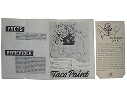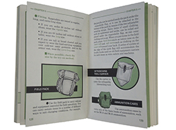 - アイテム説明米軍で使用されていた、各種個人装備に関するマニュアルです。1977年2月15日発行と記されており、合計217ページです。フェイスペイントの説明書と、防虫用ヘッドネットの説明書も付属します。内容は簡潔なイントロダクションに始まり、個人装備を常に清潔かつ使用可能な状態に保つ義務がある旨や、様々な汚れに対する対処法、使用してはならない液体や器具の注意書き、破れほつれの修繕方法、種々のベルトの結び方、テントやタープなど野外用寝具の使い方、各種戦闘用・生活用装具の取り扱い方など、個人用の装具に関する広範な解説が記されています。基本的には絵や図・文章による解説が多く、整備行程を撮影した写真などは余り見受けられない印象です。表紙には掠れや擦り傷があり、また全体的に若干の日焼けが見られますが、文字の判読が困難なほどの汚れや破れは少なく、良い状態を保っています。(TU)