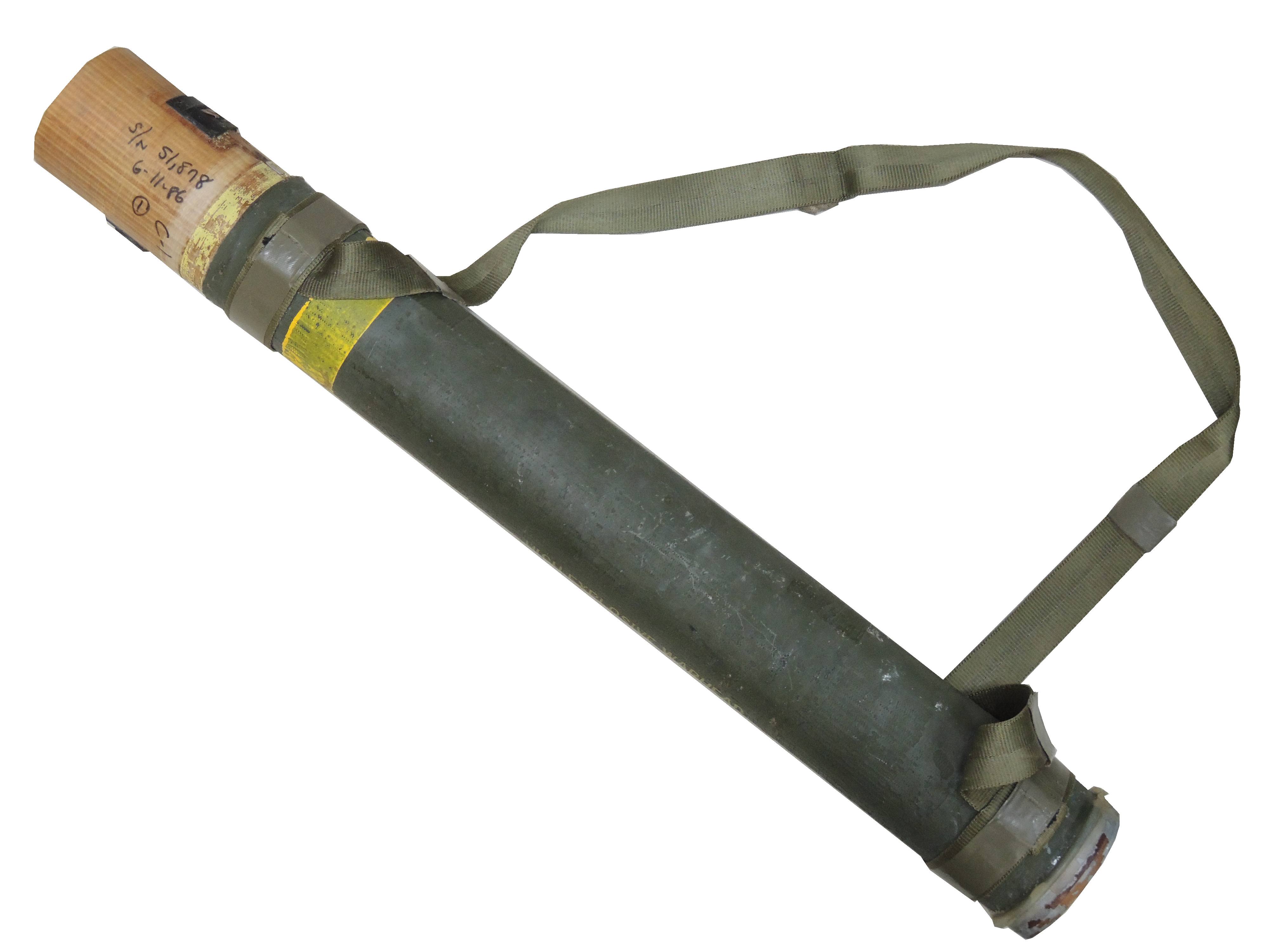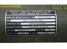 本体には「ROCKET, ASSAULT, ENCASED, 83MM, DUAL MODE, (SMAW) MK 3 MOD 0」のモデル名が入ったステッカーが貼りつけられています。 「DUAL MODE」とある点から、固定目標や各種指定目標に対して発射可能な、模擬ではない多目的弾頭が装填されていたものと思われます。 McDONNELL DOUGLAS社製で1986年7月製造となっております。 やや使用感は見受けられ、擦れや小傷は見られるものの、大きな破損や塗装の剥がれも殆ど見られず良好な状態が保たれています。 スポンジ製の緩衝材も経年劣化や傷みは少なく、しっかりとした状態です。 スリングが付属し、こちらにも目立つ千切れ・ほつれは少ない印象です。使用済みのコンテナ部分のみであり、火薬等は一切入っていない安全品です。 (TU)- 詳細画像