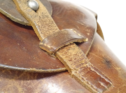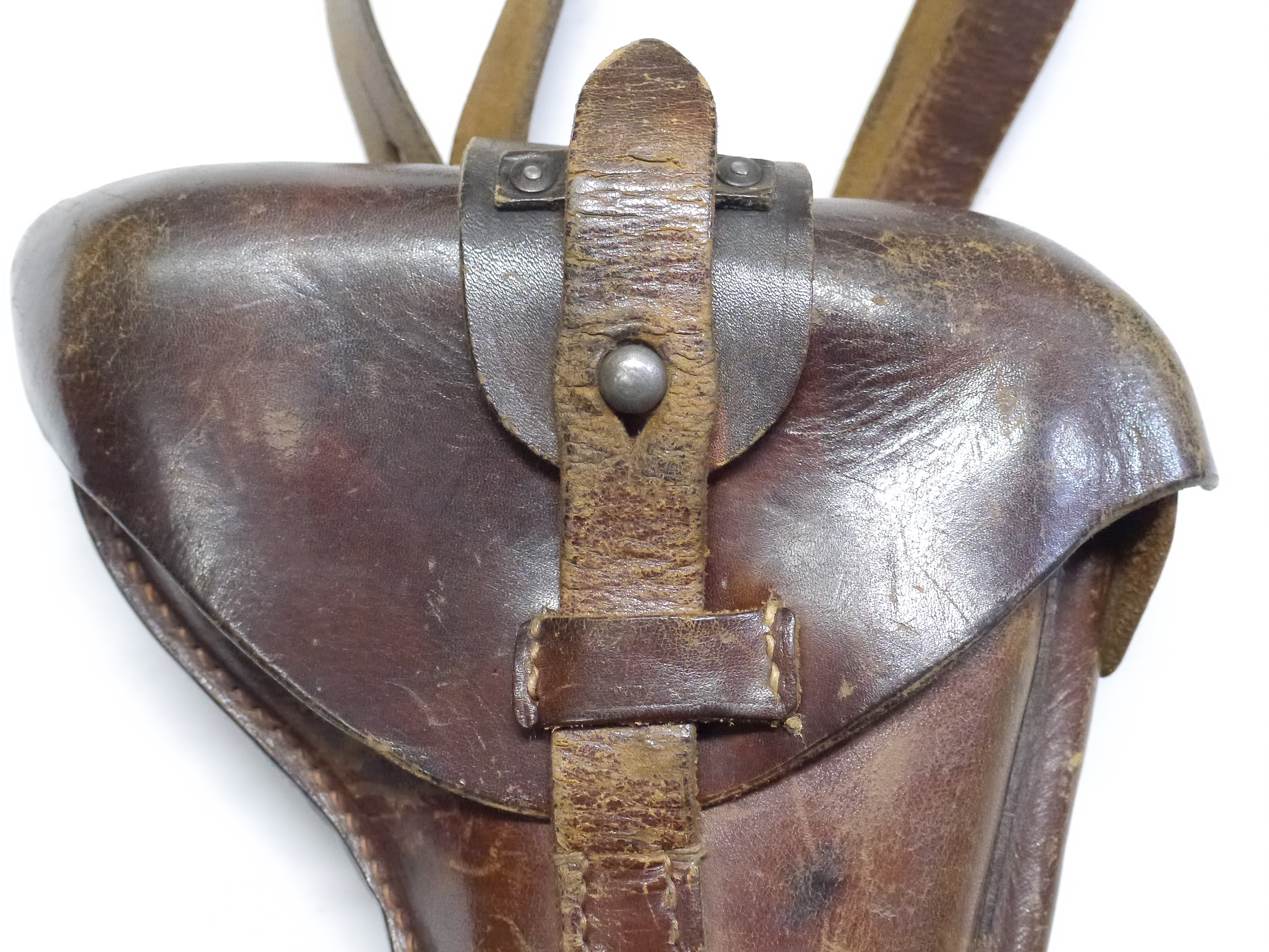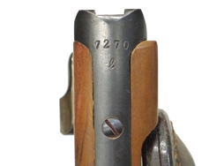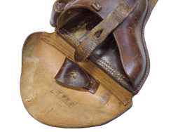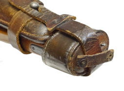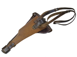 - アイテム説明ルガーP08のボード・ストック & ホルスター、ランゲラウフ(8インチ)用です。 ホルスター、ストラップ、木製のボード・ストックで構成されています。 ボード・ストックには王冠にSの刻印が見られます。 ショルダー・ストックのアッパー・タン部分には7270lの刻印が見られ、アッパー/ロアー・タン部分のブルー仕上げは良好に残っています。 ホルスターのフラップ裏には刻印が見られますが、薄くなっており判別は困難です。 革には経年による細かなヒビや擦れ等見られますが、比較的柔かさを保っており時代を考慮すると生地の程度は良好と思われます。 ショルダー・ストックのレール部を覆う革製カップの金具の片側が外れていますが、現状ベルトは健在のため勝手に脱落してしまう事はありません。 現存するランゲラウフ用ボード・ストック & ホルスターの多くはこのカップが欠品しており、オリジナルのカップが残っているのは貴重と言えます。 総じて欠品や大きな破損は見られず、革の経年による使い込み具合も良い雰囲気です。 なお、トイガンへの使用は弊社専門外のためお答えいたしかねます。 (TK)
