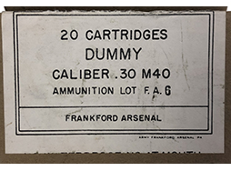 本品はフランクフォード造兵廠製で、紙箱には「20 CARTRIDGES DUMMY CALIBER .30 M40 AMMUNITION LOT F.A.6」の印字が見られます。 紙箱は経年による若干の汚れや開封時の破れ等が見受けられます。 ダミーカート本体は経年による若干のくすみや変色は見受けられますが、目立った破損等は見られず全体に良好な状態が保たれています。 ヘッドスタンプは「F A 54」となっています。 雷管は元々装着されておらず、装薬の一切入っていない安全品です。 (KK)- 詳細画像