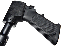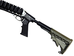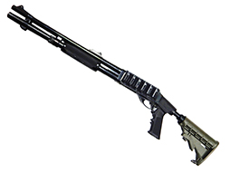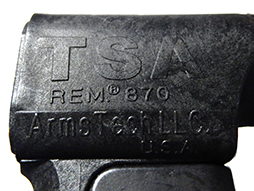 レミントン M870ショットガンに装着して使用するArmsTech社製伸縮式ストックです。 左側グリップ上部にはTSA REM 870 Arms Tech LLC U.S.A.の文字が確認出来ます。