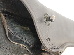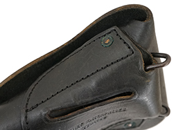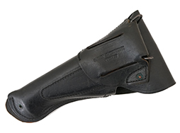 - アイテム説明米軍がM1911用に採用したM1916ホルスターです。 本品戦後の黒革製です。 ホルスター裏面には「CATHEY ENTERPRISES 7791466」の文字が見られます。 全体的に使用感が見られ、革生地表面には擦れて黒染めが薄くなり、黄色っぽくなっている箇所が見られます。 僅かに型崩れが見られますが、縫い糸の解れ等は見られません。 フラップ裏面のスウェード加工には銃を収納した際に付いたと見られる跡が残っています。 フラップ裏のスウェードはやや褪色により緑っぽくなっています。 リベットや鳩目金具に緑青の付着が見られますが、機能的な問題はありません。 レッグ・ストラップは付属していません。 (TK)