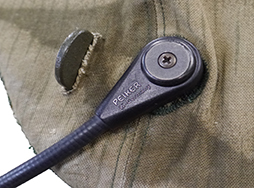 本品はヘルメット本体と西ドイツ仕様(国境警備隊で使用されたパターンの)ヘルメットカバー、無線機とケーブル、予備のヘルメット・カバー1枚がセットになっています。 シェル本体に破損は見られず状態は良好です。 シェル内側にはスポンジ状のクッションが貼り付けられています。 革製のライナーには56のスタンプが見られます。 こちらも大きな破損は見られず、極僅かな擦れとヨゴレが見られる程度です。 顎紐に付いている差し込み式の金具もしっかりとロックが掛かります。 インカム・マイク側面にはPEIKER W-Germanyのモールドが見られます。 マイクは任意の位置で使用出来るように約240°の可動域がありズムーズに可動します。 付属の無線機にはMOTOROLA MX3031のモデル名が見られます。 ヘルメット内臓のヘッドセットと接続するためのコード及び端子が付属していますが、経年によりコードの皮膜に割れや剥がれが見られます。 無線機及びヘルメット内臓ヘッドセットの動作確認は行っていないため、作動保証はいたしかねます。 端子金具にサビ等腐食は見られません。 ヘルメットに装着されているコットン製カバーには擦れや小さな破れが見られ、一部パターンが薄くなっている箇所見られます。 予備のヘルメット・カバーには殆どダメージは見られません。
