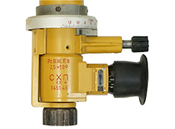 - アイテム説明装甲監視所用ペリスコープ (Pz.B.W.F.8)です。 ブンカー(装甲監視所)の上に付いている小さなドーム型の監視窓に取り付けて使うペリスコープで、装甲が20cm以上のものに対応しています。 鮮やかなカーキ色の再塗装が施されており、小さな剥落はみられますが、全体的に塗膜が良好に残っています。 本体にPz.B.W.F.8、2,5x19、 cxn K.F.+ 145146の刻印があります。 顔面への緩衝具は欠品していますが、緩衝具を押し込む事によってシャッターが開放される機能に問題はありません。 視度調整リングと左右に視界を振るプリズムのノブ共にスムーズに可動します。 プリズムの上部には「+cxn 72355」の刻印が見られます。レティクルに細かい塵が散見されますが、視界は充分にクリアです。 イルミネーター用の窓から光を入れるとレティクルが鮮明に発光します。 (YS)