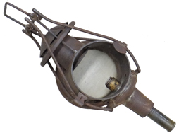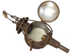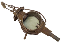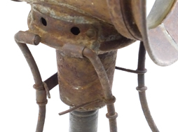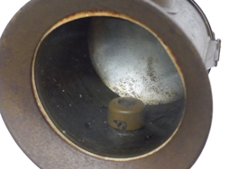 蝋燭ケース、発条、蝋燭立て(蓋状の部品)、蝋燭固定用のキャップが付属します。 欠品は無く、緑鉄色塗装も9割ほど残っています。 取手や折り畳み脚に時代相応の錆が見られますが、展開・収納は現状問題なく行えます。 反射板の錆も最小限です。 上記ブログにて蝋燭を用いた作動を確認している個体です。