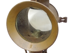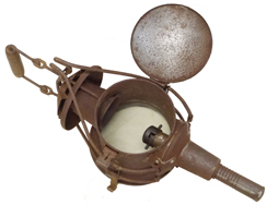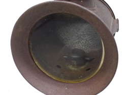 - アイテム説明日本陸軍の陣営具である隠顕灯です。 隠顕灯(いんけんとう)とは日本陸軍で戦地や演習において使用された、蝋燭を光源とした携行用の照明機材です。 夜間の照明以外にも通信や演習時の目標指示にも使われました。 本体下部の筒状のケースに蝋燭を収納し、蝋燭が短くなった場合には蝋燭ケースを螺子って火が消えないように調整する仕組みです。 また、上部の煙突状の部分には空気を取り入れる給気口が開口されています。 留め金具を外し二本の脚を畳んで持ち運ぶ事も可能で、行軍時には背嚢に縛着して運搬されました。 戦後も国鉄等での使用が見られます。