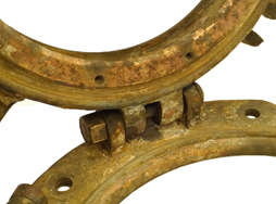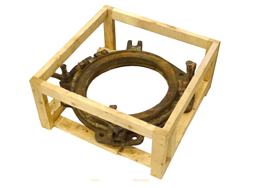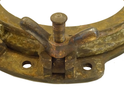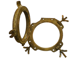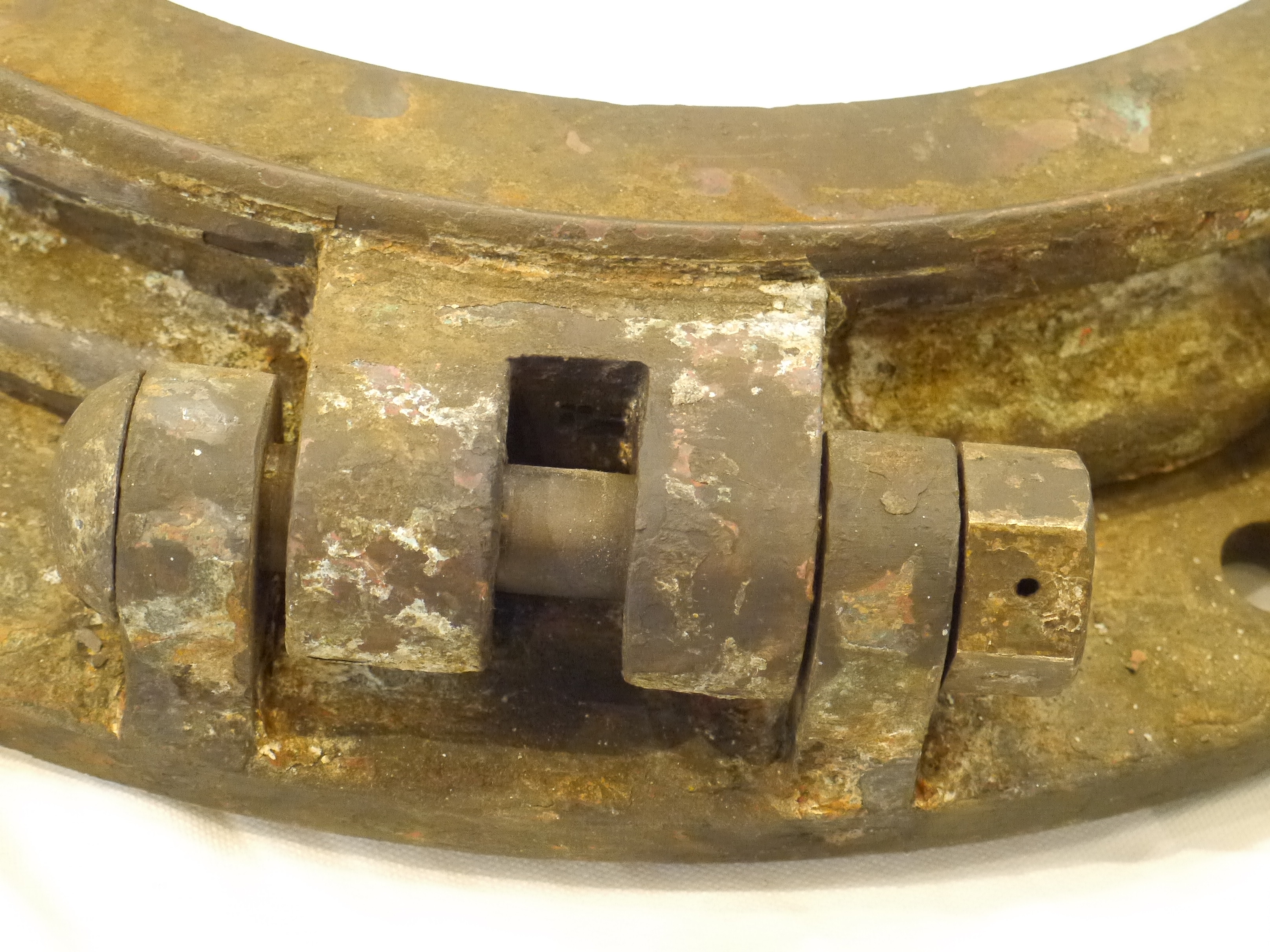 大型艦艇用 士官室等で使用された物と思われる 舷窓(げんそう)部は砲金製舷窓の径42.5cm 舷窓部内側のゴムパッキンは硬化するも残存付 窓の強化ガラス部は爆沈時の爆圧により欠 窓部の開閉用蝶ネジ(=回し金、合計3箇所)は極めてスムーズに可動、窓部の開閉もいたってスムーズに可動