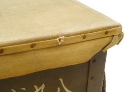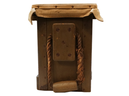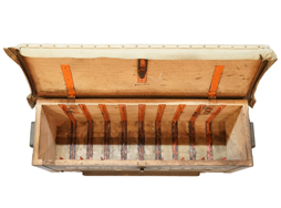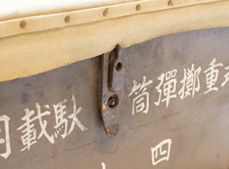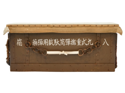 - アイテム説明日本陸軍の部隊備品である八九式重擲弾筒 駄載用弾薬箱です。 表面/裏面には「八九式重擲彈筒 駄載用彈藥箱 四十箇」の筆書きの白文字が見られます。 内部には昭和16年 名古屋工廠製を示す焼印が見られます。 天井部に帆布あり、左右取手付で内部完全品となっています。 蓋の留め具もしっかり機能し、開閉も問題なく行う事が出来ます。 背面には駄載用の吊鎖(合計2個)付きです。 木部に大きな割れや痩せは見られず、全体的にしっかりした状態です。 全長:約74,3cm 高さ:約28,9cm (TK)