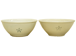 本品は兵庫県神戸市の旧高射砲陣地付近にあった納屋から戦後発見された未使用品です。 飯碗の胴(外側)付近に陸軍を示す「星印」が見られ、高台裏(台座部分の内側)に陶工を示す「肥 28」の文字が見られます。 「星印」や「肥 28」の文字は個体によって薄いものもあります。 上から見ると真円でない個体もありますが、手作りならではの味とも言えます。 その他釉薬のムラも少なく、製造時に出来た表面仕上げの不良や保管時に出来たヒビも少なくなっており、総じて程度は良好です。 食器としての実用性も概ね問題はなく、未使用品を手入れした物ですので日常使いにもおすすめです。 複数在庫品ですので、程度の良い個体から販売いたします。 (TK)- 詳細画像