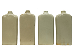 - アイテム説明日本陸軍 下士官兵用 水筒 (陶器製)です。 陸軍の陶器製墨壷と似た外観ですが口の部分はキャップをねじ込む為のスクリュー加工が施されており、昭和19年以降の本土決戦を見越した兵員大量動員を補う為の戦時代用水筒とされています。 本品は陶器製の本体のみで蓋は付属しません。 個体差が見られるものの概ね 高さ:約18,5cm 横幅:約8cm 奥行き:約5cm 飲み口の直径:2,3cm(何れも最厚部)となっています。 どの個体も押印等は無く、底面のみ釉薬の塗布はなく素焼きのままとなっています。 表面の釉薬の色味や状態には個体差が見られ、成型時や焼成時に出来たと思われる表面処理の荒れや角部に仕上げ剥落がある個体も見られます。 また陶器の厚さが異なる為、重量も若干個体差がありますが、手作りならではの味と言えるでしょう。 総じて全体的な程度は良くほぼ未使用品と思われます。 複数在庫品の為、程度の良い個体から販売いたします。 (TK)