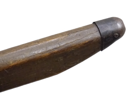 - アイテム説明旧軍の三十年式銃剣 末期型(ラバーライズド剣差付)です。 製造年代や工廠によって柄や鍔、刀身の形状にバリエーションがある三十年式銃剣ですが、本品は柄の側面がフラットな形状で、更なる省力化のため刀身の血抜きの樋(彫溝)が無くなった末期型です。 従来の三十年式銃剣に比べ、金属部には全体的に機械加工跡が残った荒々しい造りとなっています。 金属資源の節約のために鞘は木製となっており、所謂モナカ構造の鞘を張り合わせて糸で縛り、その上から塗料によって固められています。 刀身は14cm未満で切断されており、切断済みの剣先が付属します。 刀身の根元付近には松下金属工業製を示す刻印のみが打たれています。 黒染めの刀身には中頃(切断済み刀身の真ん中部)には軽度の朽ち込みが見られますが、現状落ち着いています。 その他の箇所で大きな錆や朽ち込みは見られません。 刀身は先端から約32cmの位置まで刃付された跡があります。 木製の柄は左面下部に2cmほどの欠けが見られる以外に大きな割れは見られません。 柄頭にはやや打刻が乱れていますが、シリアルNo.の「いみ79600」と検査刻印が確認出来ます。 木製鞘には若干塗装の剥落が見られますが、大部分に国防色の塗装が残っています。 張り合わせ構造の鞘を巻き付けている糸の一部に解れが見られます。 木鞘の先端付近に3箇所のクラックが見られ、こちらはやや取扱に注意が必要ですが、現状では欠けや分離には至っていません。 金属製の鯉口、剣吊、鐺に関しても経年に伴う若干の表面錆が見受けられる程度で、しっかり取り付けられています。 また、鐺は小型なものが取り付けられています。 ラバーライズ剣差は素材特有の経年による硬化が見られ、擦れや銃剣の留め金(ロック用のボタン)が当たる位置に凹みが見られるもののシルエットは完全です。 剣吊を留める革バンドの一部が千切れており、バックルが欠品しています。