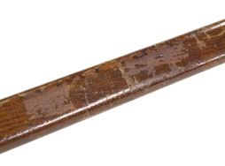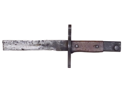 - アイテム説明旧軍の三十年式銃剣 末期型です。 製造年代や工廠によって柄や鍔、刀身の形状にバリエーションがある三十年式銃剣ですが、本品は更なる省力化のため刀身の血抜きの樋(彫溝)が無く、柄の形状も単純な四角形となった末期型です。 金属資源の節約のために鞘は木製となっており、所謂モナカ構造の鞘を塗料で固めています。 刀身は14cm未満で切断されており、切断済みの剣先が付属します。 刀身の根元付近には一部かすれているものの、陸軍名古屋造兵廠下の豊田自動織機製を示す刻印が確認できます。 刀身は朽ち込みが散見され、機械加工による血抜きの樋(彫溝)が設けられています。 刀身は片方向から研がれており片刃となっています。 研ぎ直しによって刀身は白磨きっぽくなっていますが、根元付近にはオリジナルの黒染め仕上げも残っています。 木製の柄は若干の打ち傷が見られる以外に割れや欠けは見られません。 柄頭にはやや打刻が乱れていますが、シリアルNo.の「ろわ46414」と検査刻印が確認出来ます。 木製鞘はニスの剥落や張り合わせの線が見られますが、大きな割れや破損は見られません。 金属製の鯉口、剣吊、鐺に関しても経年に伴う若干の表面錆が見受けられる程度でしっかり取り付けられています。 鐺は小型なものが取り付けられています。