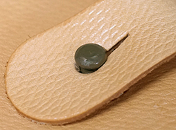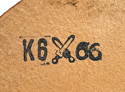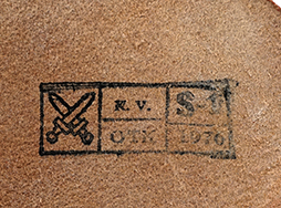 一方、後期 (70年代頃) に製造されたマガジン・パウチでは、フラップ内側のスタンプが枠線で囲まれたスタイルとなり、クロス・ソードや製造年、各コードがやや小さく打たれるようになっています。 後期型ではギボシの頭が若干尖った形状となり、パウチの縁に取り付けられたパイピングが濃い色合いとなっています。 また、1976年製のパウチのみ、リベットの色がグレーではなく黒色となっています。 尚、個体により、仕様が混在している可能性がございます。