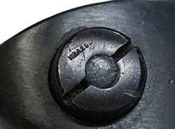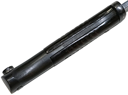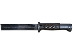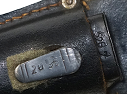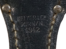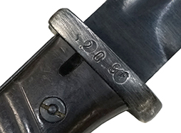 - アイテム説明Kar.98k 銃剣です。 刀身は根元から約14cm未満で切断されており、剣先が付属します。 鞘のシリアルNo.は鯉口に6267(8816)、剣差しの掛け金に2096、銃剣は2096となっています。 金属部は全体的に擦れて地金っぽくなっています。 グリップ上部の金属板には細かな朽ち込み痕が見られますが、刀身の傷や朽ち込みは少なくなっています。 革製の鞘受けは欠品しています。 銃剣のロック・ボタンにはアムト刻印が確認できます。 ベークライト製グリップには若干の小傷や摩耗が見られますが、こちらも大きな破損等は見られません。 着剣装置のロック金具や鞘内部の板バネもしっかり機能しています。 鞘にある収納時の銃剣を完全にロックする為のネジが欠品しており、ネジ穴は溶接にて塞がれています。 革製剣差しにはSSのシンボルマークや1942年にPELTEZR&Co.にて生産されたことを示す刻印が見られます。 革の表面には僅かな小傷や表面仕上げの剥落が見られますが、全体的にはかなりしっかりとした状態が保たれています。 (TK)