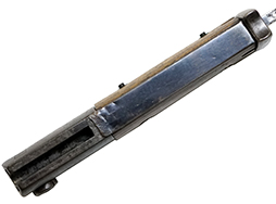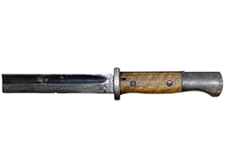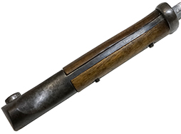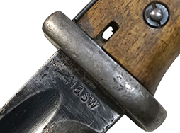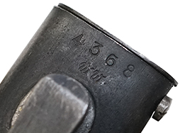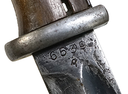 - アイテム説明Kar.98k 銃剣です。 刀身は根元から14.5cm未満の位置で切断されており、切断済みの剣先が付属します。 鞘のシリアルは4368wwで、やや薄くなっていますが1943年にE&F Horsterで製造されたことを示す「43 asw」の刻印が見られます。 銃剣の刀身根元にはシリアルの6539qと「41 asw」の刻印が確認でき、銃剣本体と鞘で製造メーカーはマッチしています。 銃剣本体の金属部には若干の小傷や打ち傷が見られます。 刀身のブルー仕上げは大部分で落ちてしまっており、刃こぼれが一カ所見られます。 革製の鞘受けはありません。 グリップ・フレーム上部の板に若干の変形が見られます。 グリップ・フレーム、ロック・ボタン、鞘の石突部分にはアムト刻印が見られます。 木製グリップ・パネルに関しても若干の打ち傷が見られるものの、割れやクラックはありません。 着剣装置のロック金具や鞘内部の板バネのテンションもしっかり残っています。 (TK)