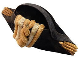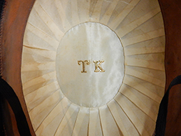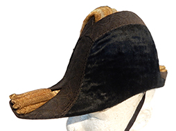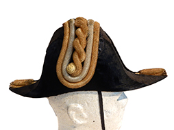 正帽は大礼帽、礼帽、二角帽子や仁丹帽とも呼ばれましたが後に「正帽」と改称されましたこの品は佐官用正帽で右側飾章には中に金のねじった籠目金線がありそれを籠目銀線が囲み、その外周には1本の籠目金線があることから佐官用ということが見て取れます。全長は約39cm、全高約16cm、全幅約15.5cmで帽内やモール部分等に若干の経年感は見られますが時代を考えますと大変素晴らしい状態です。白絹の帽内には金字でTKのイニシャルが確認できます。
