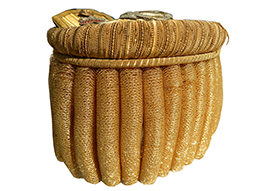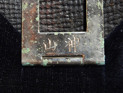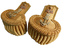 正肩章は瓢箪型で明治期には大礼服上衣肩章と呼ばれていましたが大正3年の勅令で正式に「正肩章」と呼ばれるようになりました。大尉以上に見られる特徴的な金モール(籠目金線)の総が付されていて、大佐の階級を示す五三の桐と2つの桜が確認できます。桜部分や金具などに若干の錆等が見られますが正帽と同じくこちらも極めて美しい状態を保っています。肩章の留め金具に神山の文字を見ることができます。 (AW)