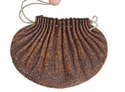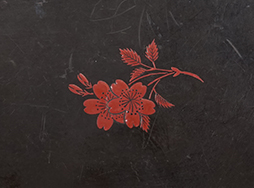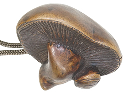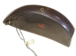 江戸時代につくられた黒漆塗の舟型の火薬入れです。 幅は約21cm、高さ約15cmの大型のもので、本体全体が反った立体的な形をしています。 本体の黒漆は茶色みを帯びており時代の古さを見てとれます。 片面に朱桜花葉蒔絵が中央に配されています。 蓋は骨製です。 革製の弾入れと木製の椎茸・栗の根付、赤サンゴのような緒締が紐で繋がれています。