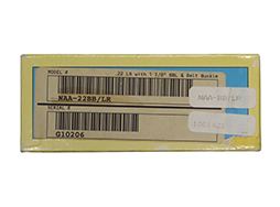 ノースアメリカンアームズのミニ・リボルバーと呼ばれる小口径リボルバーの紙箱です。側面のラベルのモデル名はNAA-22BB/LRとなっており、ベルト・バックルに収まるタイプです。