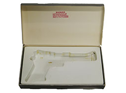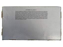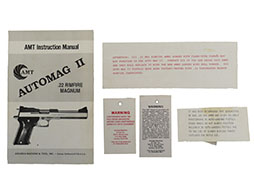 .22 RIMFIRE MAGNUM弾を使用するAUTOMAGIIの純正紙箱です。 箱にはAMT社のロゴ及びAUTOMAGII、箱側面にはアドレスなどが書かれています。 箱には若干のシワが見られますが大きな潰れや変形は見られません。 内部には銃の形に成型されたブリスターパックが入っています。 振りスターパックはグリスの付着やフロント・サイト部付近に割れが見られます。 マニュアと注意書き4枚が付属します。 (TK)