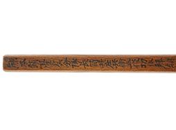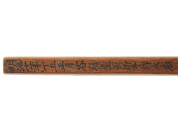 片面に「明治十年丁丑正月谷鎮臺長御手作木扇(明治10年正月谷(干城)(熊本)鎮台長のお手製の木扇)」と墨書きがされており、反対側にも「熊本鎮臺第六分隊長筒井庄兵衛正俊功依領之(熊本鎮台第六分隊長の筒井庄兵衛正俊が武功をたてたので、この木扇を拝領した)」と書かれています。