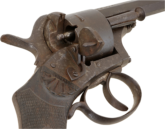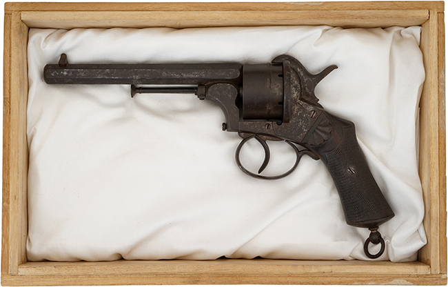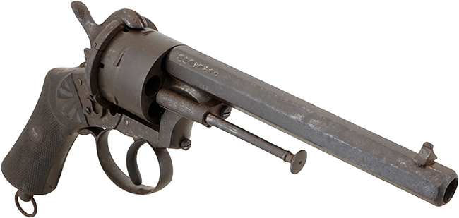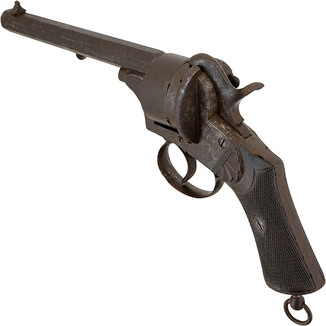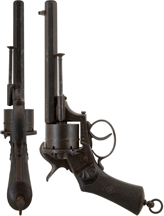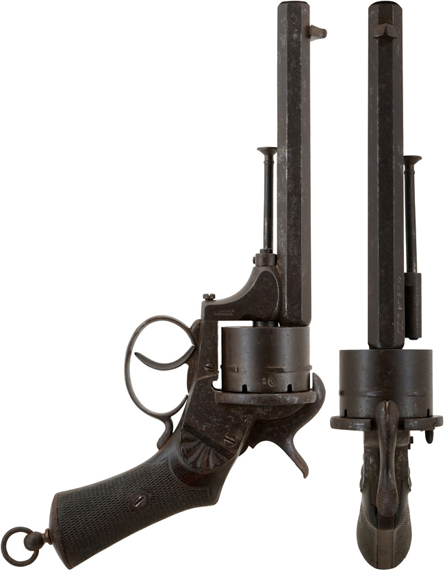 ルフォーショー (ル・フォーショウ=Lefaucheux) リボルバーは、フランスのガンスミスであったカジミール ルフォーショー (Casimir Lefaucheux, 1802-1852) によって発明されたピン・ファイア式 (カニ目打ち式) の金属製薬莢を使用するリボルバーです。 ルフォーショー・リボルバーはフランスやベルギーで1850-70年代に多種多数製造された他、英国、ドイツ、スペインでも極少数が製造されました。 また、1858年にはフランス軍が初の金属製薬莢を使用するリボルバーとしてルフォーショー M1854リボルバーとして採用しました。