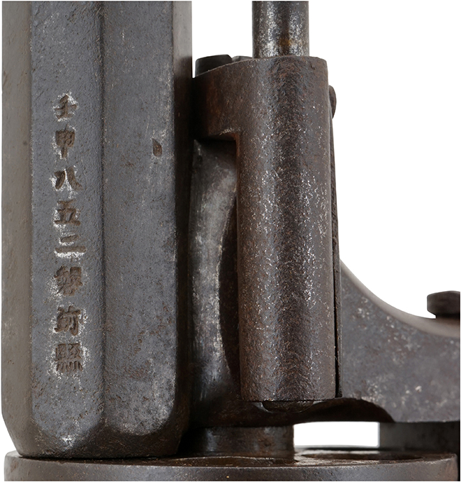 本品の銃身上面には「壬申八五二 磐前縣」の刻印が確認出来ます。 「壬申刻印」とは古式銃の一種の戸籍番号に相当します。 明治4年に明治陸軍は主力小銃の統一化を図る為、旧藩に残る銃砲の種類、挺数の把握が急務となりました。 翌明治5年 (1872年、壬申) 1月から、太政官布告第28号第五則の「銃砲取締規則」によって、私蔵されていた銃砲の「我が国初の管理統制」が始まりました。 廃藩時に旧藩は旧家臣に軍用銃を下付した事例が多く見られ、旧士族の家には一挺の軍用銃があったとも言われています。 それらの銃はその後市中に大量に出回り私蔵されていました。 銃砲取締規則ではこれらの私蔵されていた銃砲について、管轄庁 (東京と大阪は武庫司) に持参して改刻印式によって番号、官印を受ける (これが明治5年度であれば壬申刻印と番号) 事が義務付けられました。 同時に管轄庁は同人名と番号を管轄鎮台に届け出て、鎮台より武庫司にそれらが提出される仕組みになっていました。 この調査は明治20年代頃まで銃砲調査が行われましたが、明治5年 (1872年=壬申) の調査が最も大々的に行われ、今日この種類の刻印の内90-95%が壬申の年に行われた事から、古式銃に打たれた漢字の刻印をまとめて「壬申刻印」と呼ばれています。 磐前県(いわさき)は明治4年11月29日(新暦1872年1月9日)~明治9年(1876年)8月21日まで存在した県で、範囲は現在の福島県の東部太平洋沿岸(浜通り)地域と概ね一致する位置にありました。