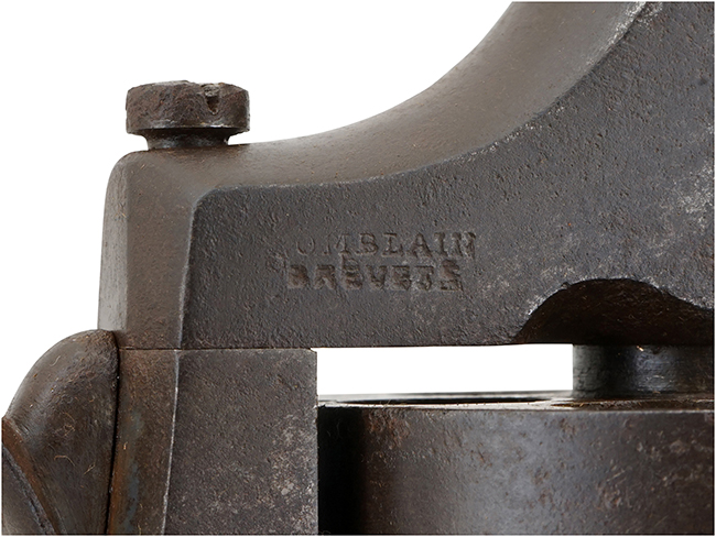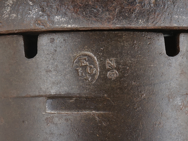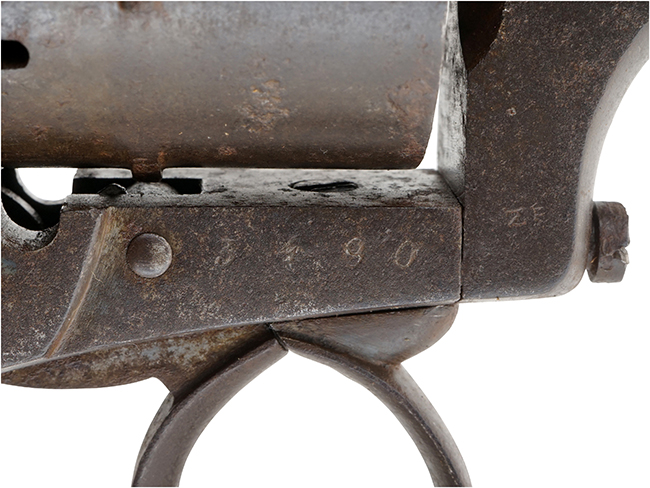 本品の銃身基部左側面のヨークに相当する部分には、「COMBLAIN BREVETE」のComblainのパテント刻印が確認出来、その反対面には王冠の下にNの文字を組み合わせたリエージュの検査官刻印が確認出来ます。 また、シリンダーにも同様に王冠の下にNの文字を組み合わせた刻印が入っている他、楕円形の中に「ELG」の文字が打たれたリェージュのプルーフ・ハウス刻印も確認出来ます。 また、シリンダー下部付近のフレーム右側面にはシリアルNo.3490が確認出来ます。
