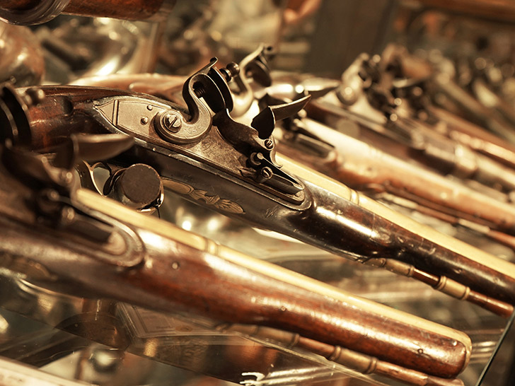 光り輝くショーケースに、古の名銃が並びます。
