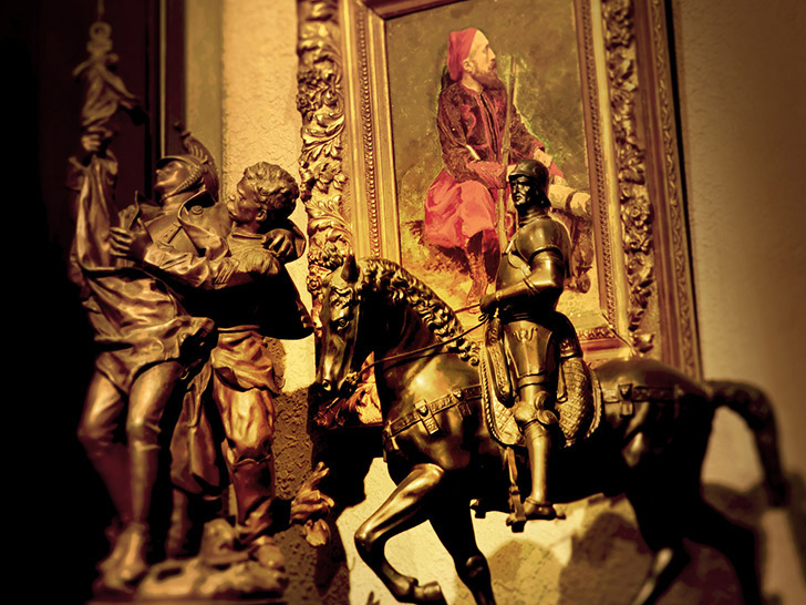 騎士の像や絵画が、空間の格調をいっそう高める。