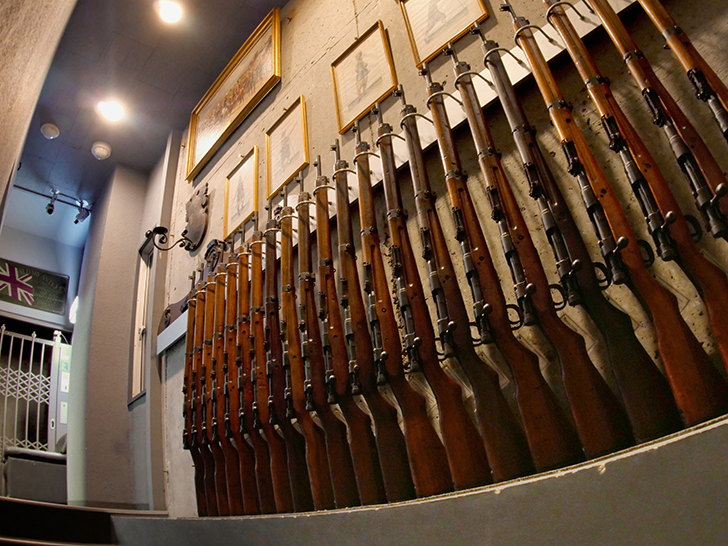 階段の壁を埋め尽くす小銃。歴史の深淵へと誘う導線。