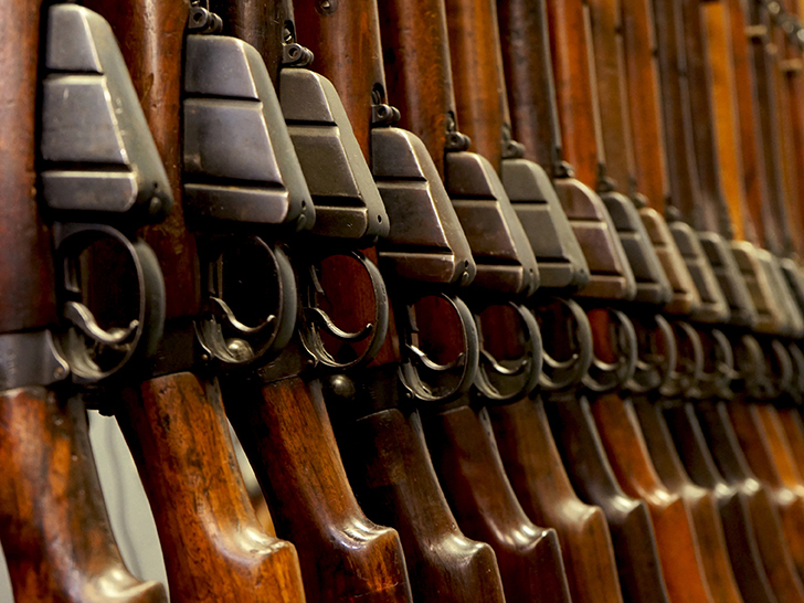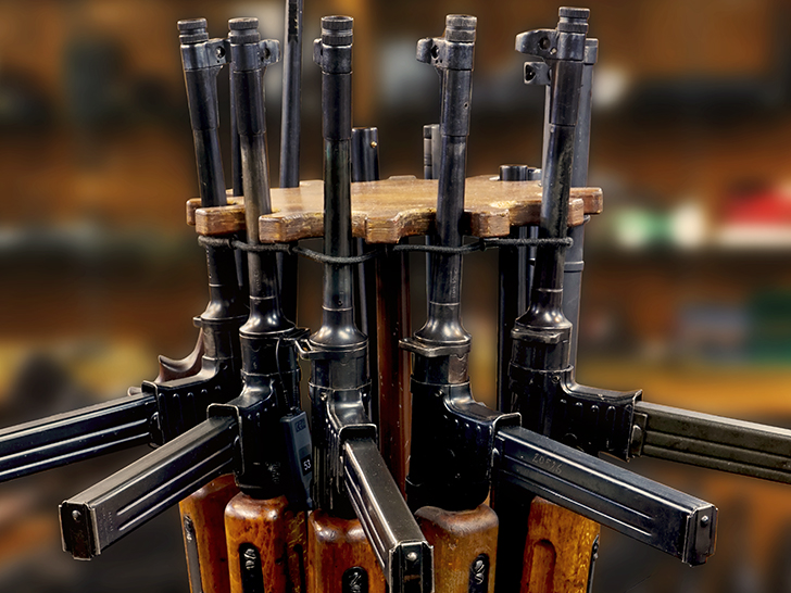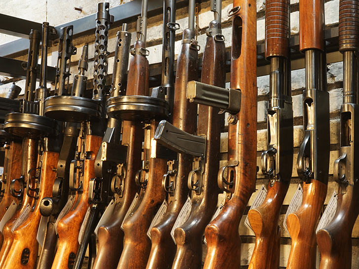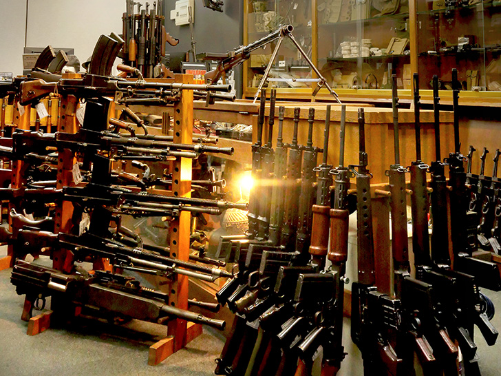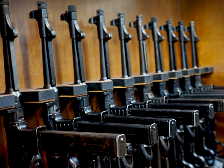 整然と並ぶ短機関銃。使い込まれた木と鉄が放つ独特の凄み。